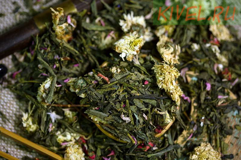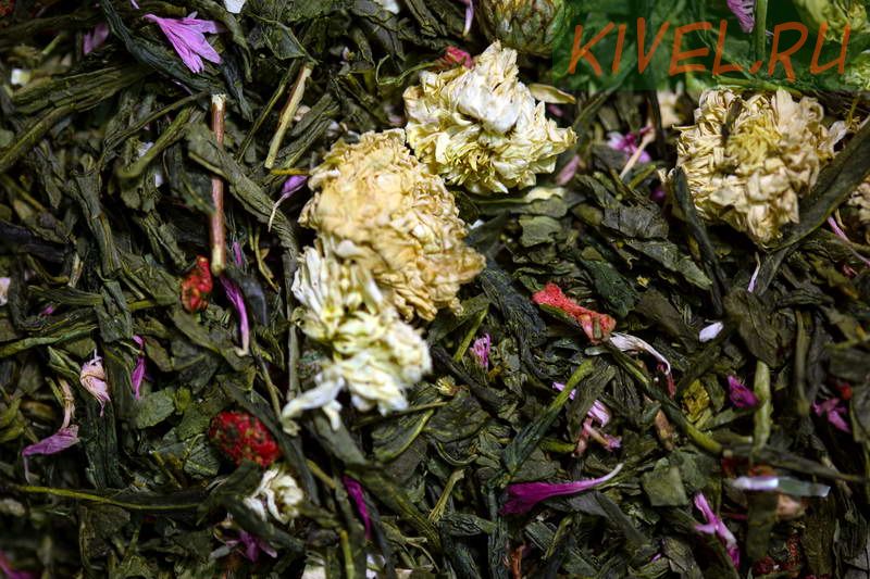 Зеленый китайский чай Сенча, кусочки клубники, цветы хризантемы, лепестки василька.