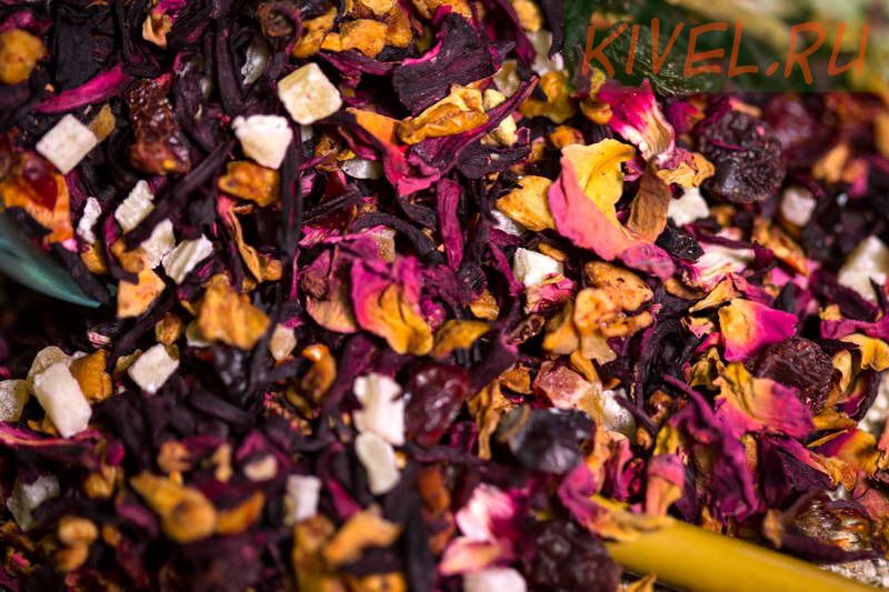 Гибискус, кусочки яблок, лепестки розового василька, кусочки клюквы, кусочки ананаса, листья смородины.